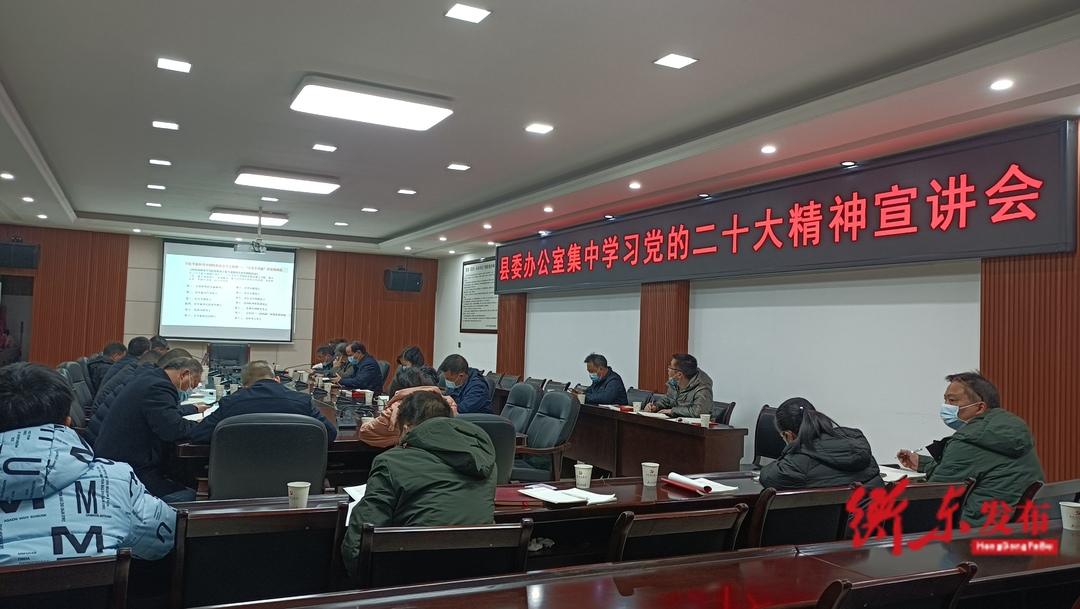 衡東融媒12月1日訊(融媒體記者 文惠芳)12月1日,縣委辦組織干部職工集中學習黨的二十大精神。宣講會上,縣委宣講團成員聚焦黨的二十大報告,從"準確把握黨的二十大的主題和主要成果、深刻認識黨的二十大的重大意義、認真領會黨的二十大精神的核心要義、全面推進黨的二十大精神落地落實"等4個方面,對黨的二十大精神進行系統宣講和深入闡釋。
