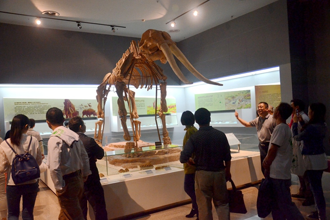 (志愿者們在古生物展廳參觀劍齒象化石)