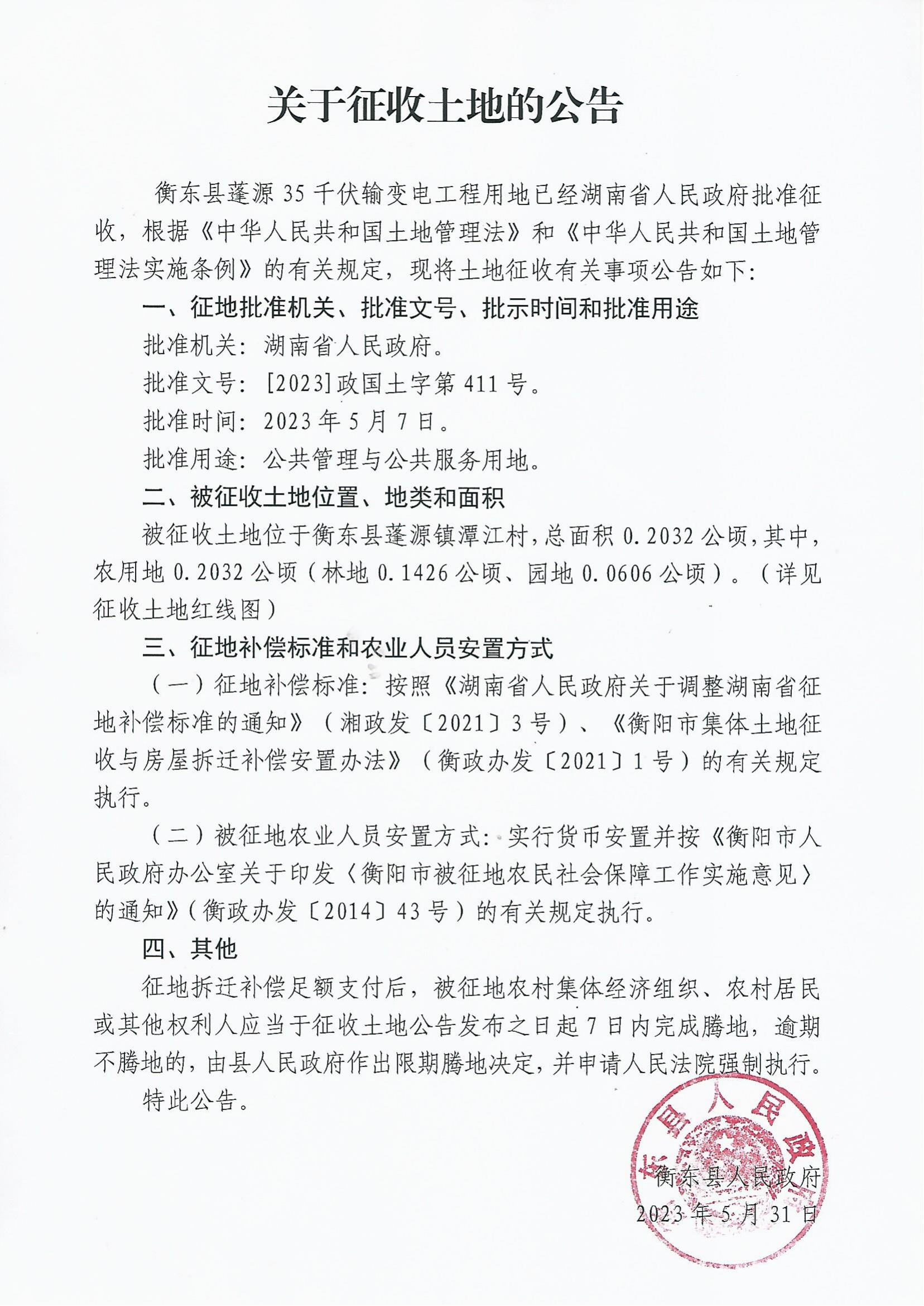 關于衡東縣蓬源35千伏輸變電工程項目征收土地的公告