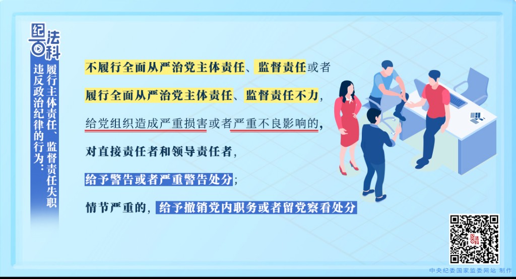《中國共產黨紀律處分條例》第七十四條規定:不履行全面從嚴治黨主體責任、監督責任或者履行全面從嚴治黨主體責任、監督責任不力,給黨組織造成嚴重損害或者嚴重不良影響的,對直接責任者和領導責任者,給予警告或者嚴重警告處分;情節嚴重的,給予撤銷黨內職務或者留黨察看處分。