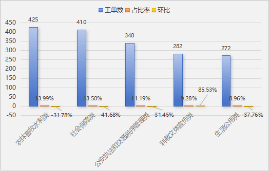 (三)訴求內容分析。2月,群眾來電訴求主要集中在:農林畜牧水利類425件,占訴求量的13.99%;社會保障類410件,占訴求量的13.5%;公安執(zhí)法和交通秩序管理類340件,占訴求量的11.19%;科教文體宣傳類282件,占訴求量的9.28%;生活公用類272件,占訴求量的8.96%。與上月數(shù)據(jù)相比,本月科教文體宣傳類環(huán)比增長85.53%,公安執(zhí)法和交通秩序管理類環(huán)比減少31.45%,農林畜牧水利類環(huán)比減少31.78%,生活公用類環(huán)比減少37.76%,社會保障類環(huán)比減少41.68%。
