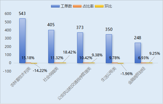 (三)訴求內容分析。群眾來電訴求主要集中在:農林畜牧水利類543件,占訴求量的15.18%;社會保障類405件,占訴求量的11.32%;公安執法和交通秩序管理類373件,占訴求量的10.42%;生活公用類350件,占訴求量的9.78%;金融商貿財經類248件,占訴求量的6.93%。與上月數據相比,本月社會保障類環比增長18.42%,公安執法和交通秩序管理類環比增長9.38%,金融商貿財經類環比增長9.25%,生活公用類環比減少1.96%,農林畜牧水利類環比減少14.22%。