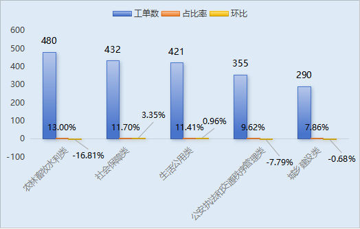 (三)訴求內容分析。群眾來電訴求主要集中在:農林畜牧水利類480件,占訴求量的13%;社會保障類432件,占訴求量的11.7%;生活公用類421件,占訴求量的11.41%;公安執法和交通秩序管理類355件,占訴求量的9.62%;城鄉建設類290件,占訴求量的7.86%。與上月數據相比,本月社會保障類環比增長3.35%,生活公用類環比增長0.96%,農林畜牧水利類環比減少16.81%,公安執法和交通秩序管理類環比減少7.79%,城鄉建設類環比減少0.68%。