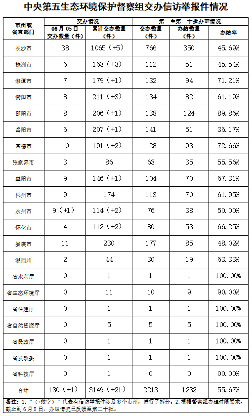 ?中央第五生態環境保護督察組今天向湖南交辦群眾信訪舉報件130件(來電舉報72件,來信舉報58件),其中重點件10件。我省分解后交辦131件,其中重點件10件。