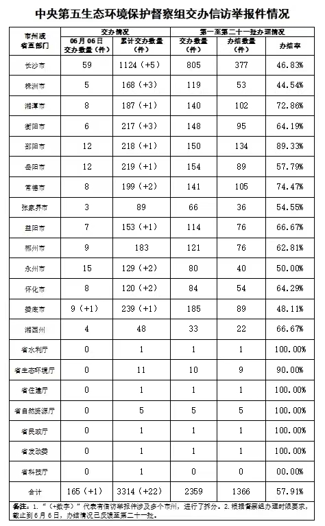 中央第五生態環境保護督察組今天向湖南交辦群眾信訪舉報件165件(來電舉報85件,來信舉報80件),其中重點件7件。我省分解后交辦166件,其中重點件7件。