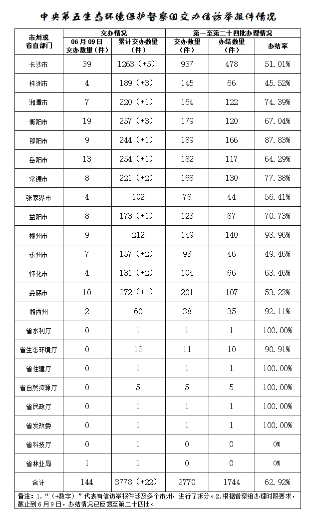 中央第五生態環境保護督察組今天向湖南交辦群眾信訪舉報件144件(來電舉報92件,來信舉報52件),其中重點件6件。