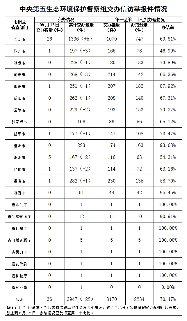 中央第五生態環境保護督察組今天向湖南交辦群眾信訪舉報件36件(來電舉報0件,來信舉報36件),其中重點件1件。
