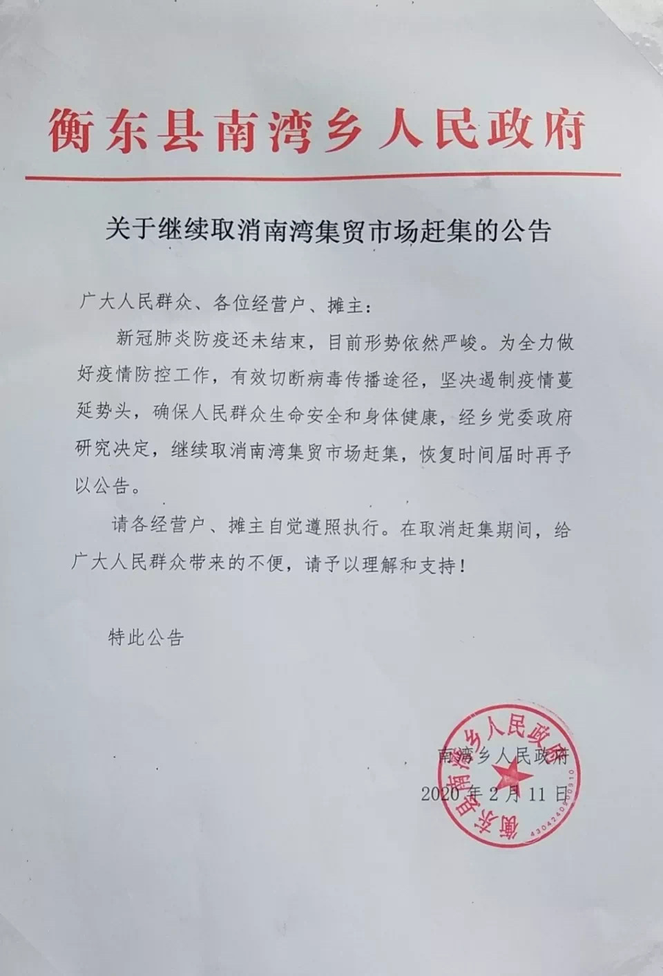 衡東縣南灣鄉人民政府關于繼續取消南灣集貿市場趕集的公告