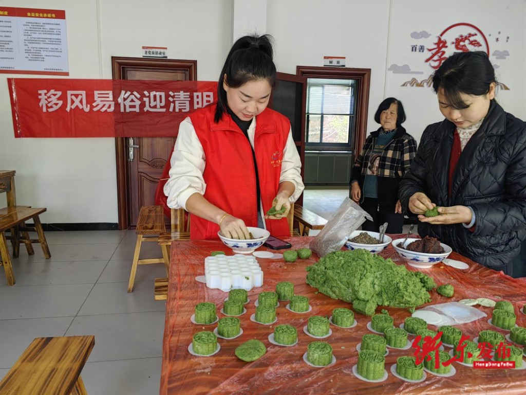 活動伊始,志愿者們到臨街居民家中,以通俗易懂的語言宣傳清明節(jié)文明祭祀的方式。隨后,邀請居民群眾參與制作青團(tuán)?;顒又校w人員圍坐一起,揉面、包餡、塑形,分組協(xié)作制作青團(tuán),工作人員還將青團(tuán)分給了來往路過的村(居)民,并宣傳了文明祭祀的重要性。