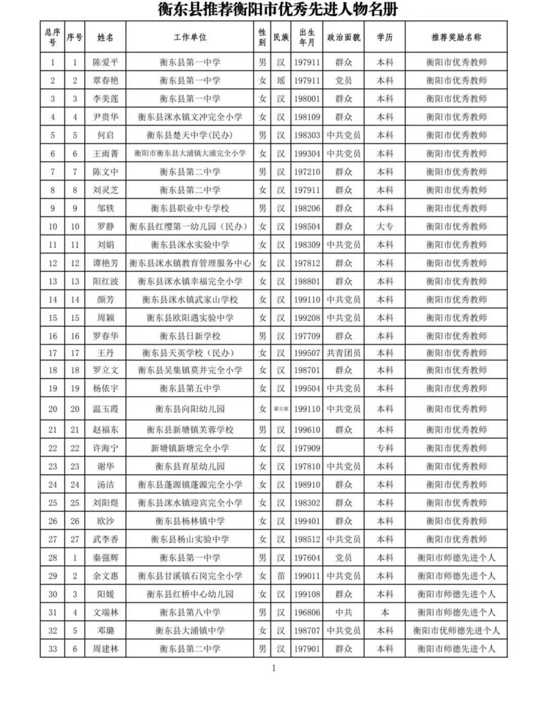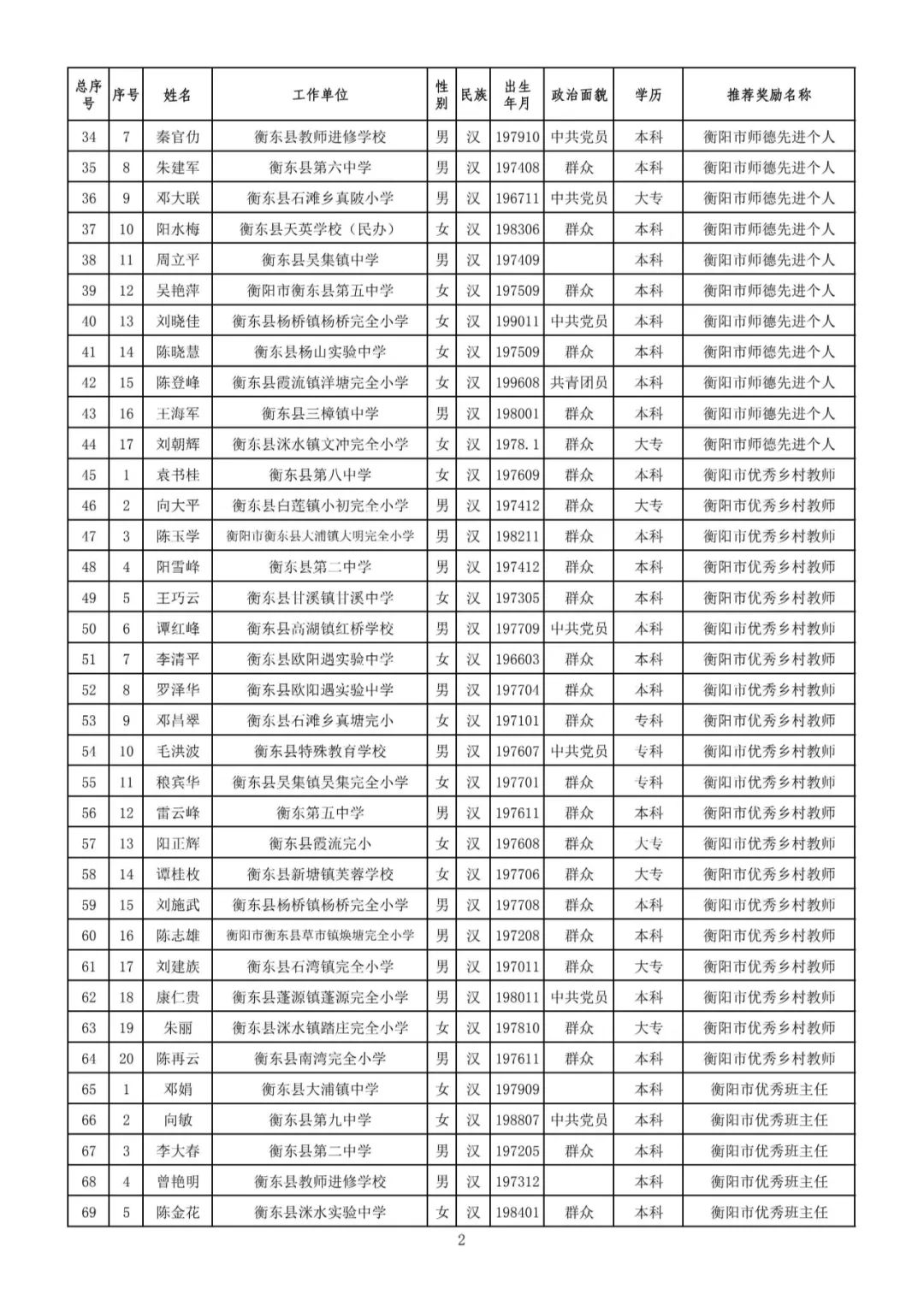 關于"衡陽市優秀教師""衡陽市優秀鄉村教師""衡陽市師德先進個人""衡陽市優秀教育