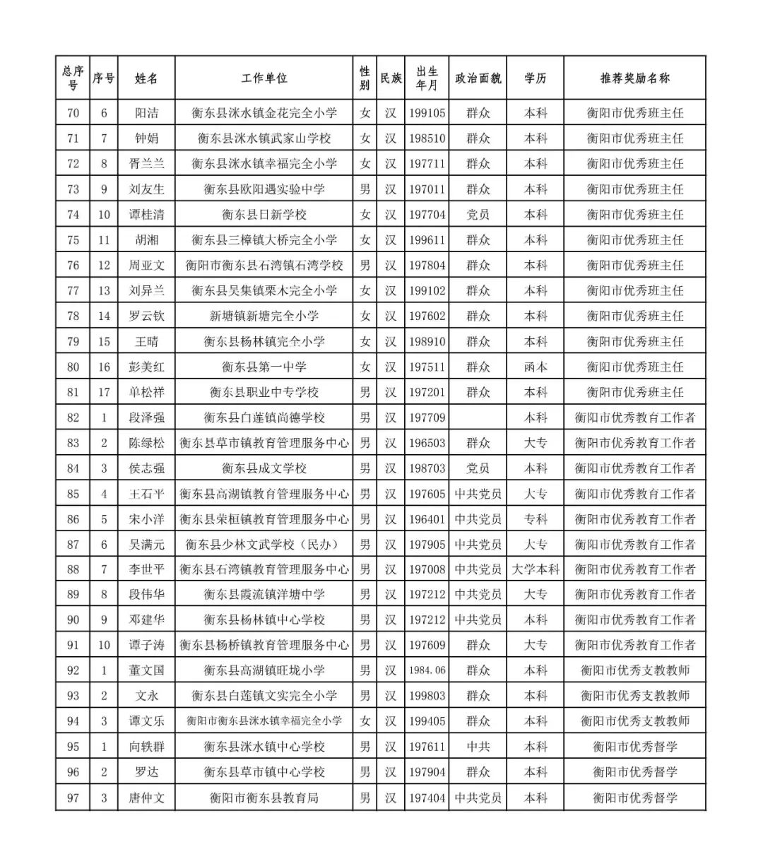 工作者""衡陽市優秀班主任""衡陽市優秀支教教師""衡陽市優秀督學"推薦人選情況的公示
