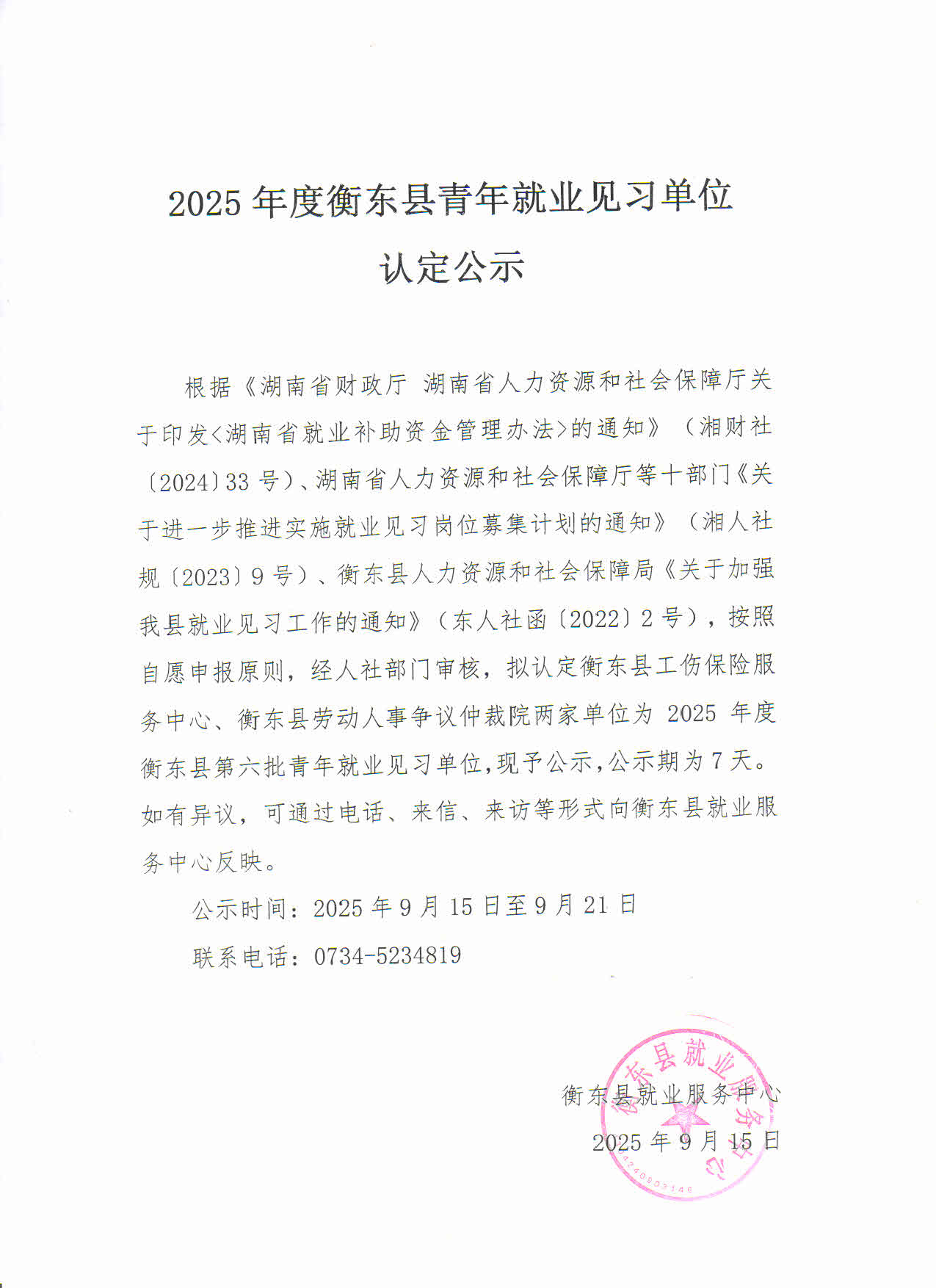 2025年度衡東縣青年就業見習單位認定公示(第六批)